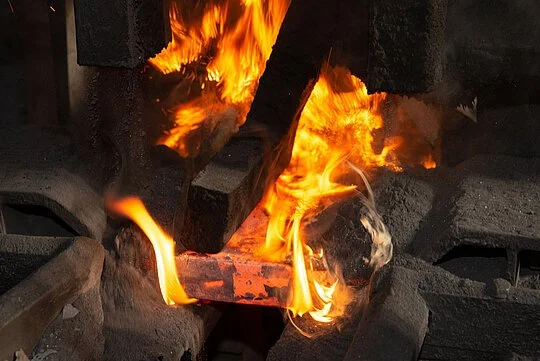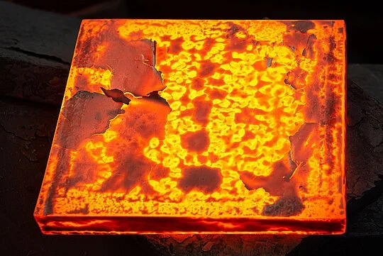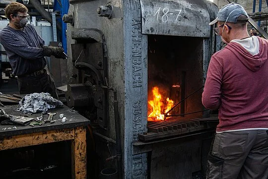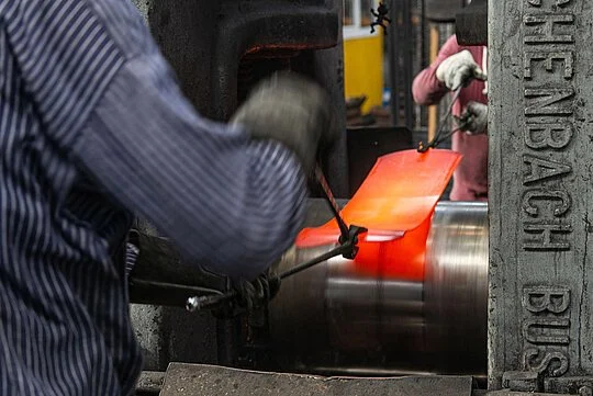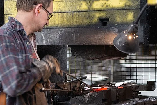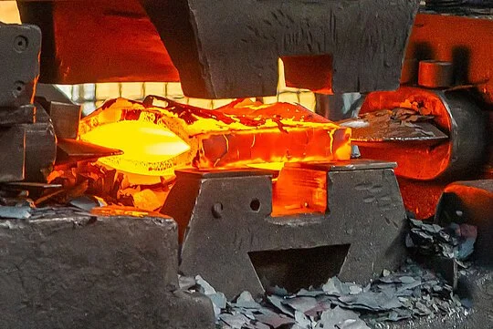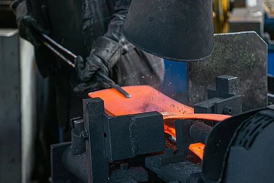 An indentation is pressed into the blank from both sides, while the steel is soft and glowing orange hot.