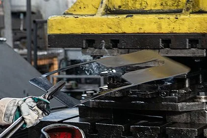 This press is giving the blade it's final design, and creating the subtle yet critical curves in the head's shape.
