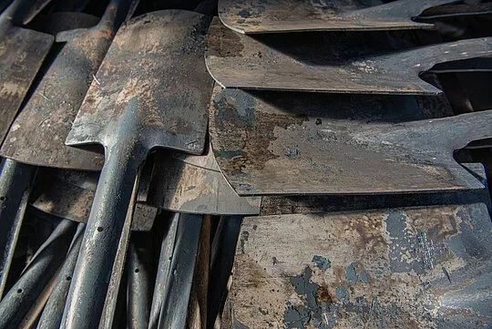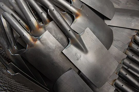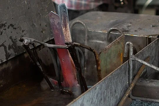 The head is now cooled in an oil bath of cold running liquid. This process quickly cools and hardens the steel into the strong and resilient shovel head.