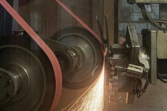 A robotic arm precisely controls the head against fine grit sanding belts, polishing the entire head. This smooths the steel surface, reducing friction and adhesion against the dirt, and helps fight against rust.